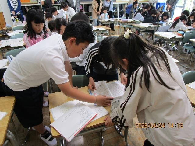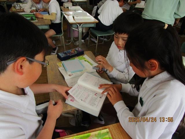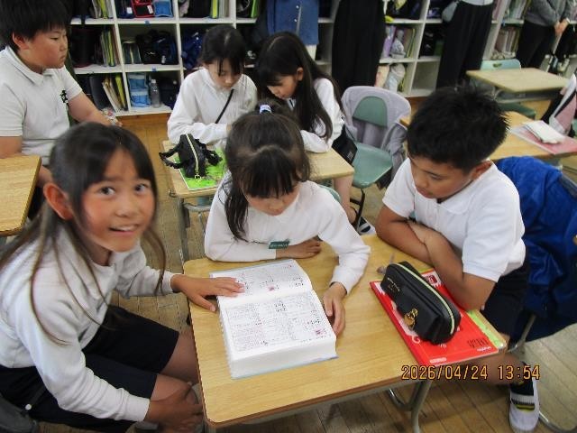 4年生は、漢字辞典の使い方を学習しました。漢字の意味や部首などについて、友達と一緒に調べました。