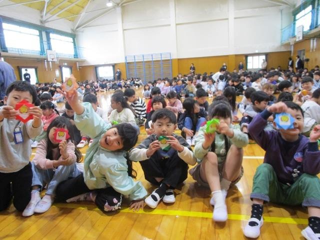 1年生に折り紙のメダルをプレゼントしました。そして、最後に校歌を歌いました。1年生も一緒に元気よく歌いました。