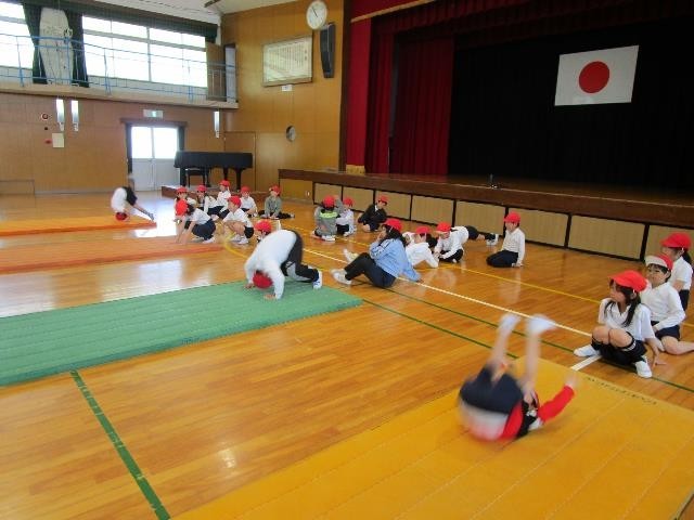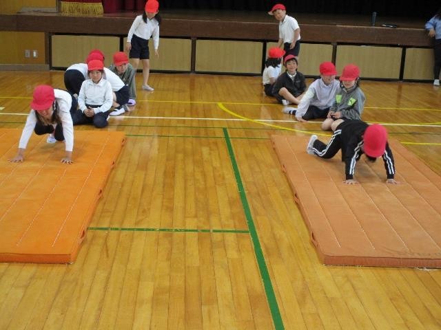 3年生が体育館でマット運動をしていました。いろいろな生き物の真似をしたり、前転をしたりして、体を動かしました。