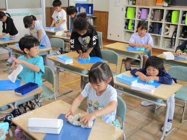 1年生が図画工作で粘土遊びをしていました。力を込めて粘土をほぐし、丸めたりのばしたりして自分の作りたい形にしていきました。
