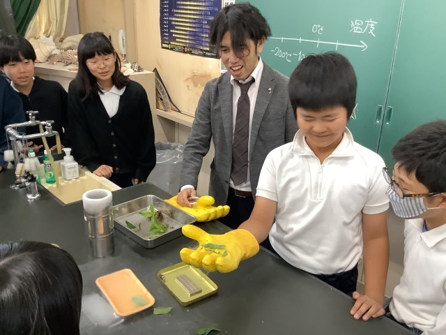 -200℃の液体窒素を使って、風船やボールをしぼませたり、超電導を起こしたり、葉っぱを粉々にしたり・・・。