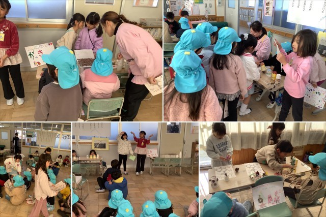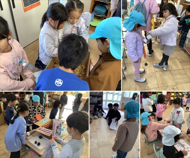 今日は1年生の児童が安城こども園の年長さんをお客さんとして招待して、秋のものを使ったお店屋さんを開きました。どの子も大きな声でお店の説明をしたり、優しく遊び方を教えたりとお兄さんお姉さんとして頑張る姿が見られました。