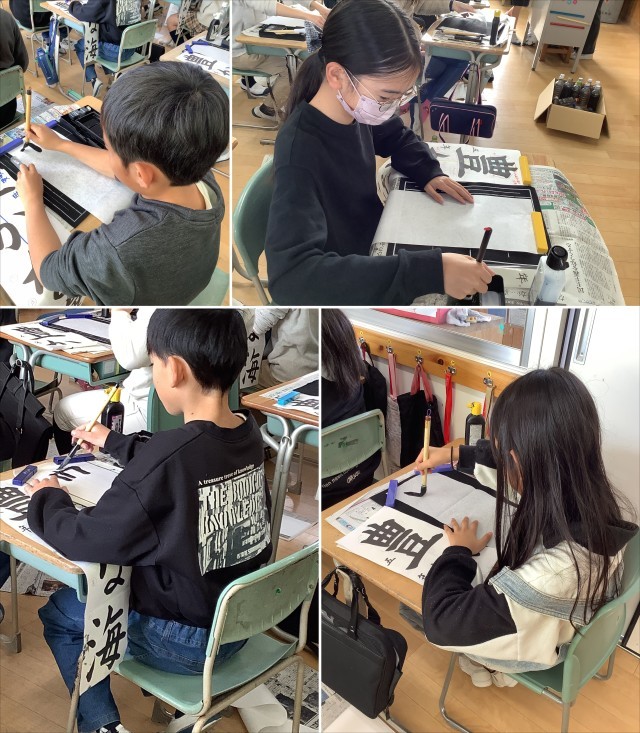 新年最初の書初め会に向けて5年生が練習をしていました。それぞれで注意することをお手本に書き込み集中して取り組んでいました。
