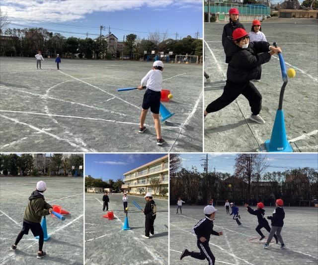4年生のティーボールの様子です。バッティングティーにのせたボールを狙ってバットで打ちます。ボールをうつときの表情はどの子も真剣です。みんなでゲームを楽しみました。