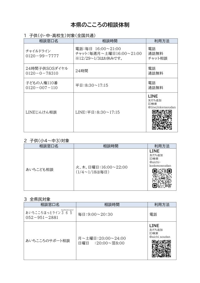 愛知県教育委員会よりこころの相談窓口についての文書が届きました。明日から冬休みに入ります。悩みや不安を抱え込まないよう、相談窓口の紹介になっています。配布文書の方にも文書を入れました。よろしくお願いいたします。