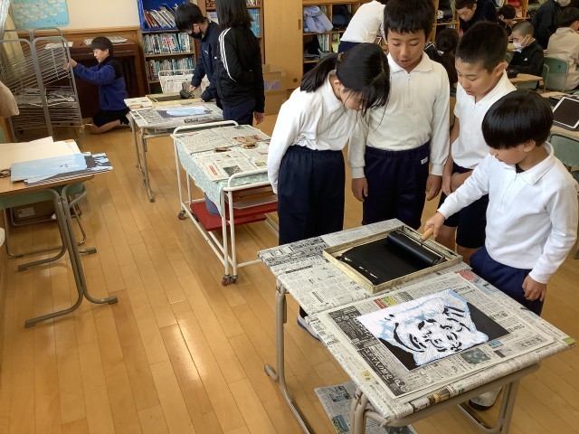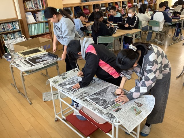 松組では、2学期に彫った板を2日間にわたって刷りました。自分でインクをのせ、バレンでこすります。めくるときには、きれいにインクがうつった作品を見て、思わず「わあ~っ!」と声が上がりました。1作品目を見て、彫りが浅かったところや彫り足したいところを調整し、2枚目を刷りました。次回は裏からインクをのせます。完成目指して引き続きかんばっていきます。
