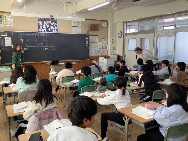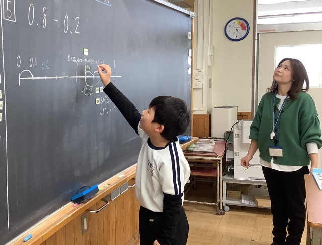 今日は、「少数の引き算の仕方を考えよう」という課題で算数の学習をしていました。子どもたちは、黒板の前て数直線を使い、自分の考えを級友に伝え合い、考えを深めました。