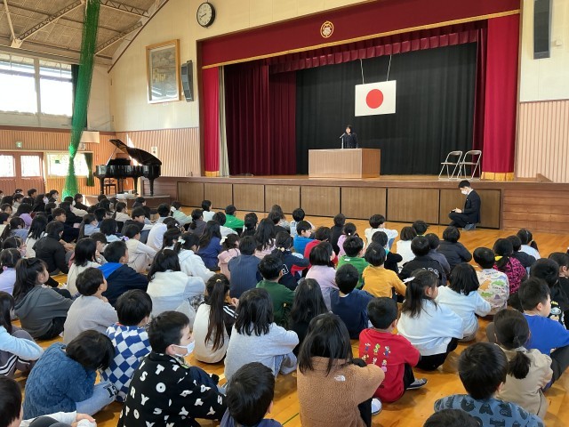 校長は式辞で、本校のスローガン「いのち かがやけ 高棚っ子」の具体的な姿について話しました。この一年間、「おはようございます」「こんにちは」などのあいさつや、「ありがとう」「ごめんなさい」などの人と人をつなぐ言葉を使うことや、様々なことに目標をもって挑戦してきた子どもたちの姿を喜び、認め、たたえました。また、一人一人が自分の目標をもち、その目標に向かって挑戦していくことが、高棚小学校を元気に明るくし、自分たちで考え、自分たちで創り上げていくことで、学校がわくわくした楽しいものに変わることを伝えました。来年度も、新しい取り組みにどんどん挑戦して、いのちかがやく高棚っ子の姿がたくさん見られることを楽しみにしていると、全校児童に呼びかけました。