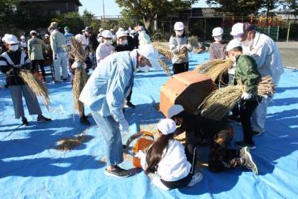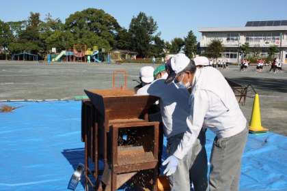 5年生は、稲を刈った後、運動場に干しておいた稲穂を昔ながらの機械を使って、脱穀しました。古い機械にもかかわらず、その仕組みに驚きでした。老人クラブの皆様、ご指導いただきありがとうございました。