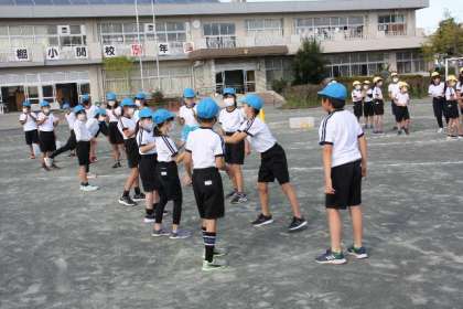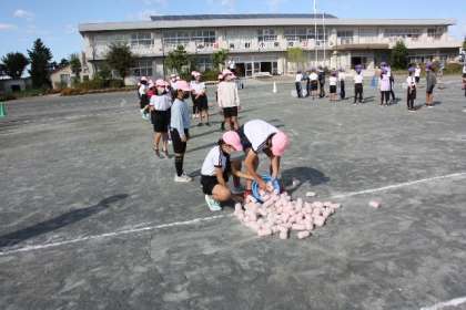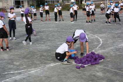 3・5年生が競遊の練習を行いました。バケツリレーが速くできるように、作戦を立てて臨みました。