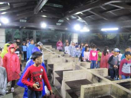 あいにくの雨です。どしゃ降りです。炊事棟で朝の集いを行いました。47人元気に参加しました。