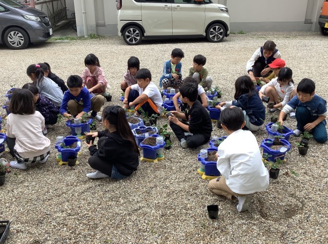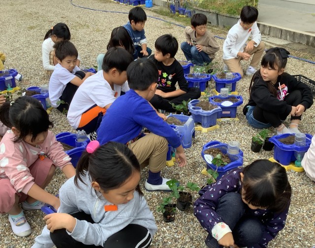 子どもたちは、「毎日、水をあげないといけないな。」「早く育つといいな。」と、互いに声をかけ合いながら植えていました。