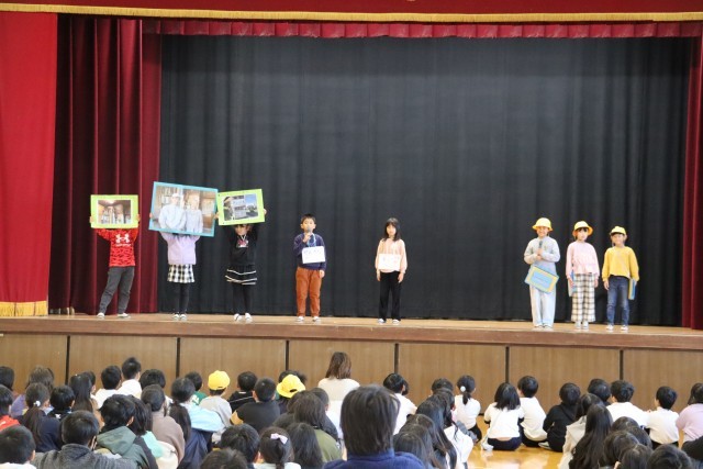 今日は、2年生が生活科の学習で学んだことを全校に、劇やクイズを交えながら発表しました。