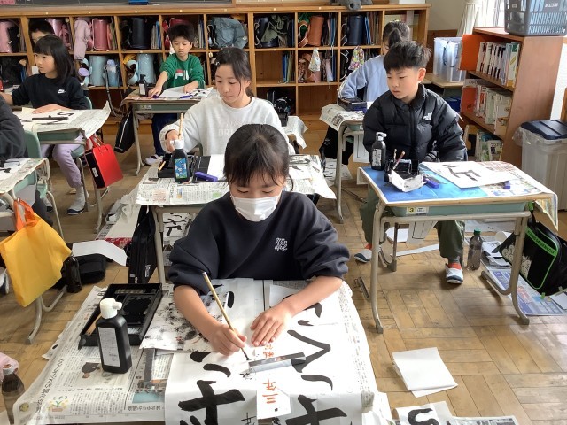 3年生は、今年から毛筆「山ざくら」に取り組みました。「とめ、はね、はらい」や、文字の中心に気を付けて書きました。