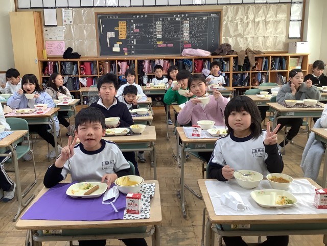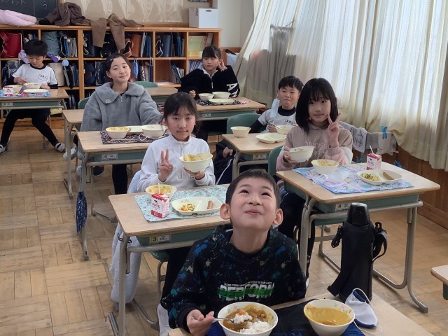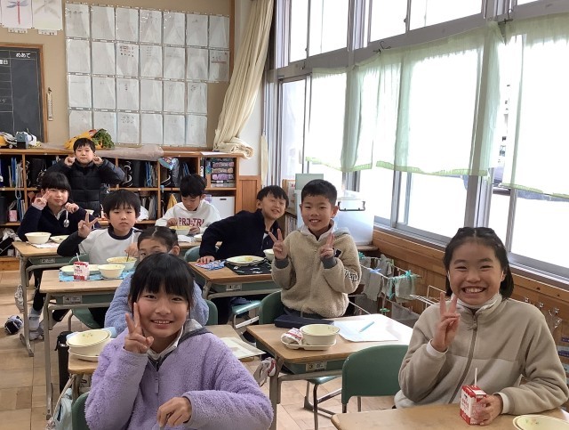 3年生の教室の様子です。もりもり食べて、元気いっぱい、笑顔いっぱいです。