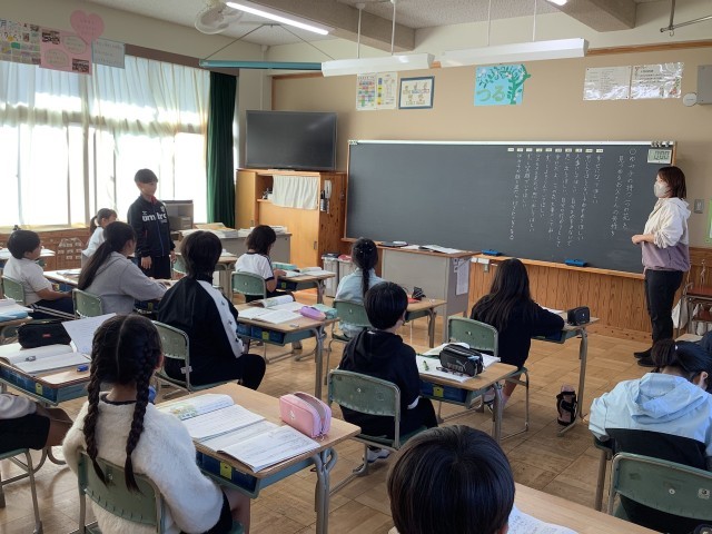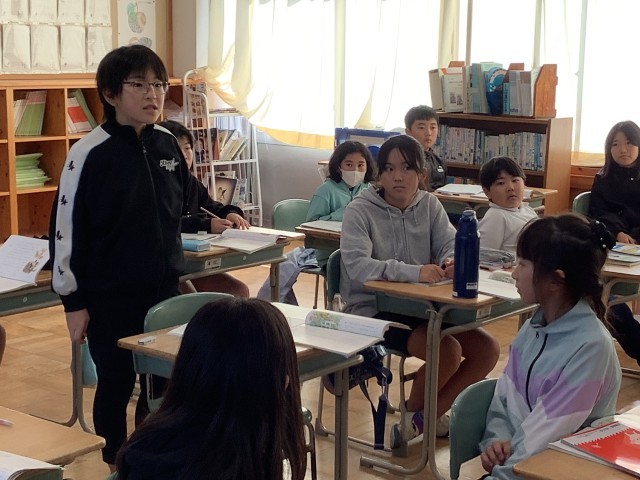 「ゆみ子の持つ一つの花を見つめるお父さんの気持ち」について考えました。「幸せになってほしい」「ずっと笑顔でいてほしい」など、仲間の意見を聞き、自分の意見に取り入れて発言する姿が見られました。仲間の意見を聞くことで、自分の意見が広がったり、深まったりして楽しいですね。
