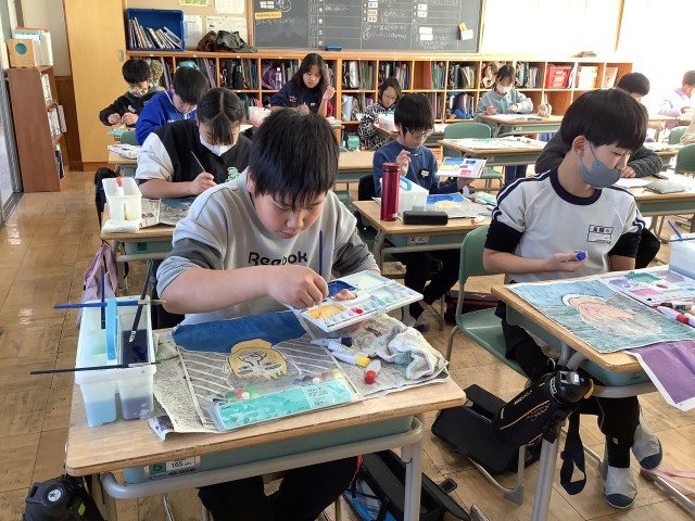 2学期は、版を作り、版画インキで一色刷りをしました。今日は、2学期に刷り上がった作品の裏から、絵の具で着色しました。