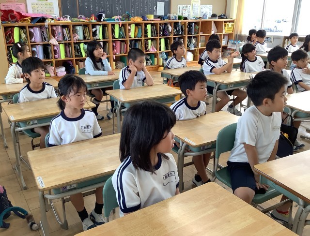 「姿勢」と「運動」について学習しました。子どもたちは、その場で足踏みをして、自分の姿勢の癖に気付きました。また、「グー・ペタ・ピン!」の合い言葉で、よい姿勢の具体的な姿を理解しました。