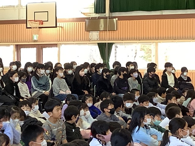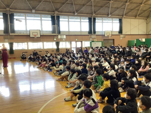 体育館に全校児童が集まり、3つのおはなし「きみは、ぼうけんか」「どろぼうねこのおやぶんさん」「ぐぎがさん、ふへほさん、おつきみですよ」を聞きました。