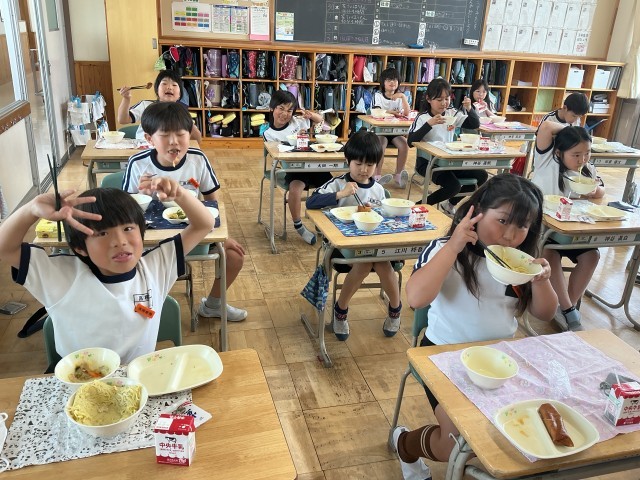 今日の給食は、とんこつラーメン、春巻き、切り干し大根ときゅうりの中華和え、小魚でした。