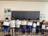 今日は全校朝会がありました。企画委員長のあいさつから始まり、ウサギとカメの最終回や表彰がありました。今日はイングリッシュルームからテレビ放送でした。