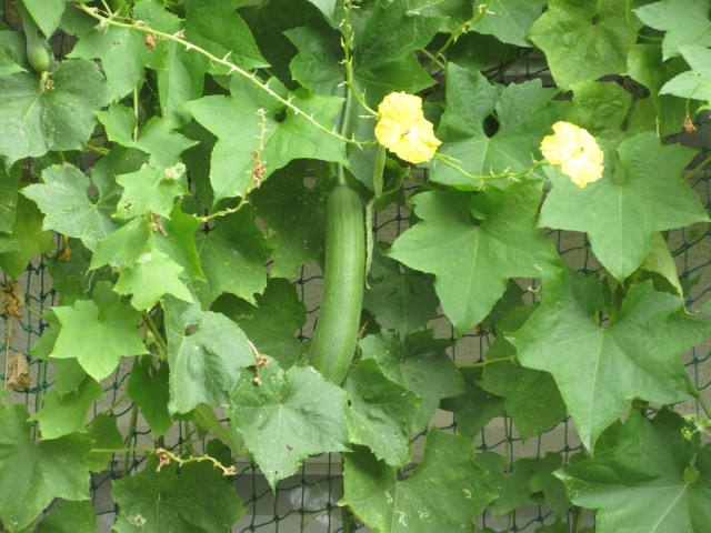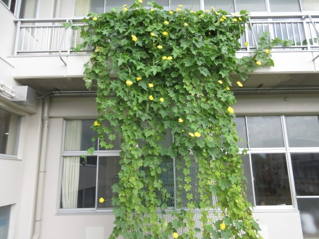 4,5年生のテラスの前にへちまが元気に育っています。