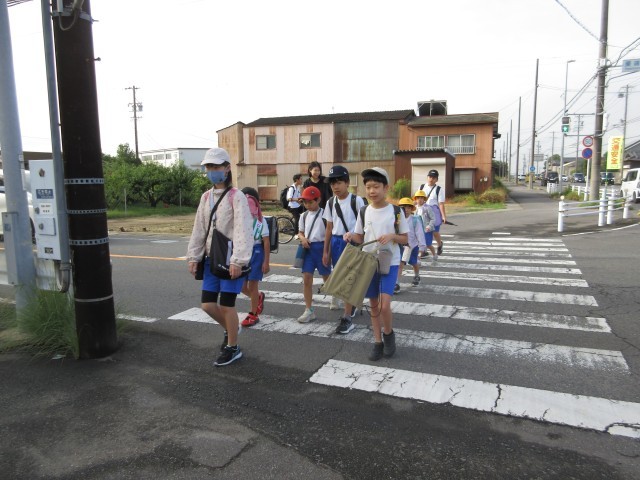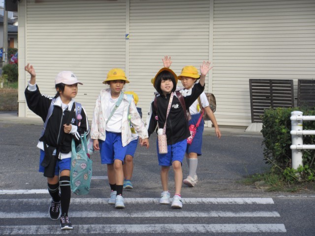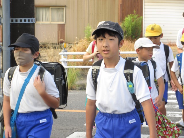 朝の登校風景。交通量の多い交差点。通学班で一緒に登校中。
