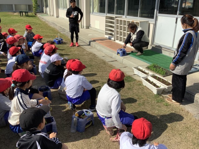 チンゲンサイ農家の杉浦さんに来ていただき、植え方から水のやり方まで教えていただきました。