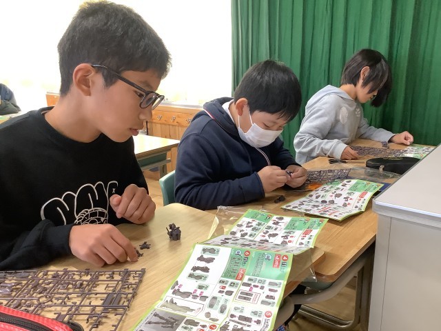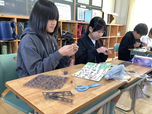 今日は、プラモデルでたくさんのパーツを組み立てる体験をしました。