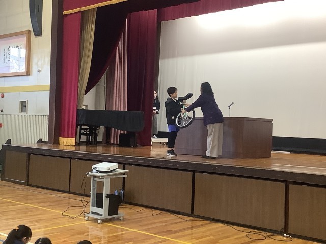 また、本校が体力づくりに取り組んでいることもあり、一輪車を寄贈してもらいました。大切に使っていきます。