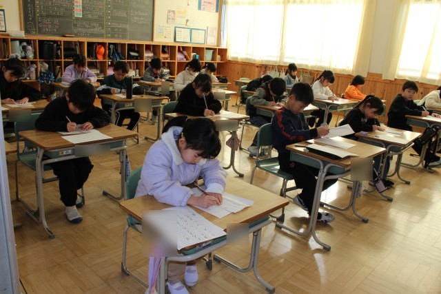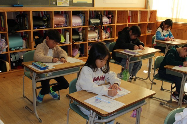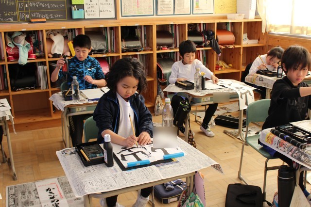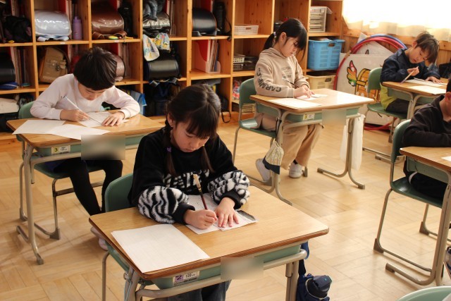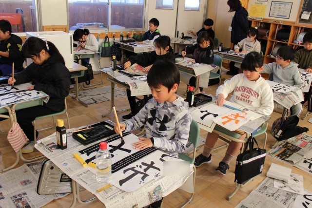 書き初めは、もともと、元日の夜露を二日の朝に集めて墨をすり、文字の上達を願ったり、その年の目標をしたためたりするものだそうです。どの子も、文字の上達を願いながら、一画一画、ていねいに書いていました。