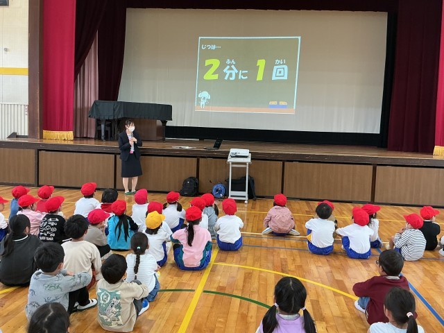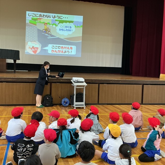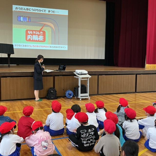 コアラドライブさんが来てくださり、交通安全教室をしました。横断歩道で待つ時の位置、止まれの標識がある場所で気をつけること、など、大事なことをたくさん教えていただきました。