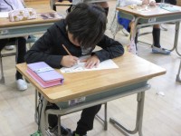 1年生は入学して2回目の給食です。当番の子は昨日に引き続き、みんなで力を合わせて配膳を頑張りました。やきそばを小型ロールパンにはさんで、焼きそばパンにしている子もいました。栄養教諭の先生も一緒においしくいただきました。