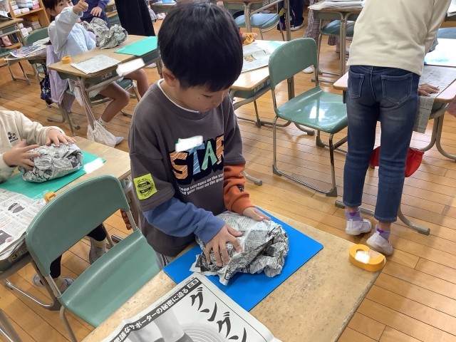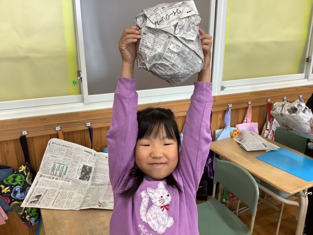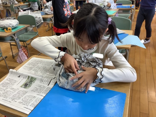 2年生 新聞紙を丸めて、お面の土台を作りました。鼻をつけようかな。角もつけようかな。思い思いに作りました。 たくさん新聞紙を持たせていただき、ありがとうございました。