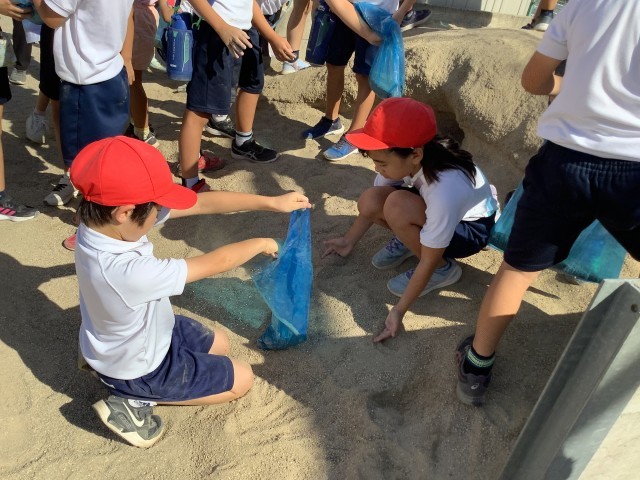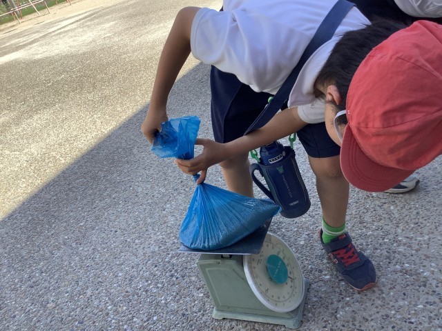 重さの学びの集大成として、トリオチームの友達と協力して、1㎏を作る活動をしました。