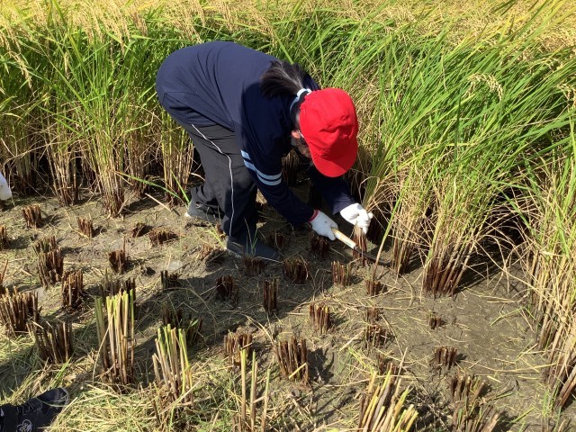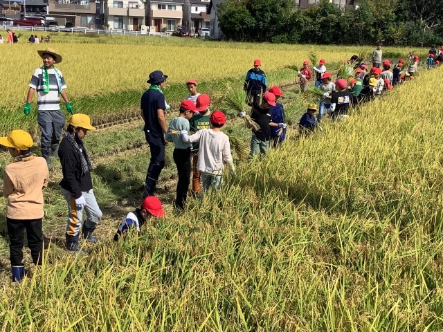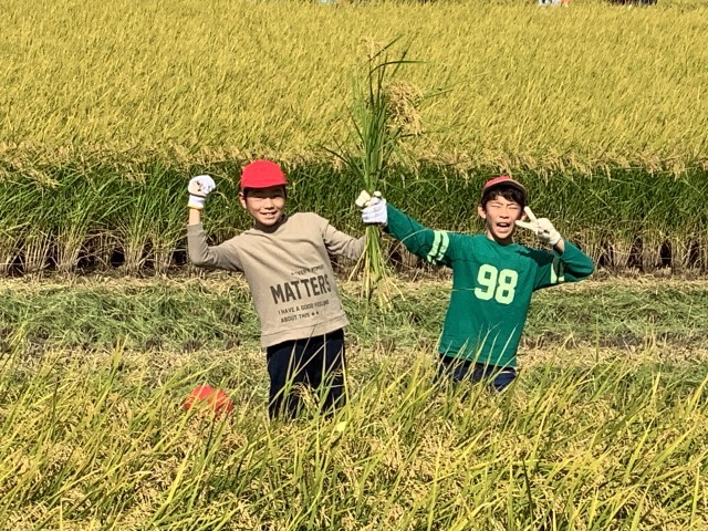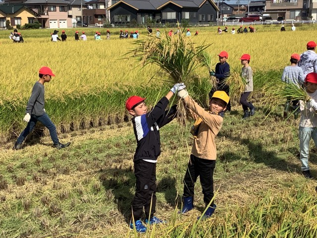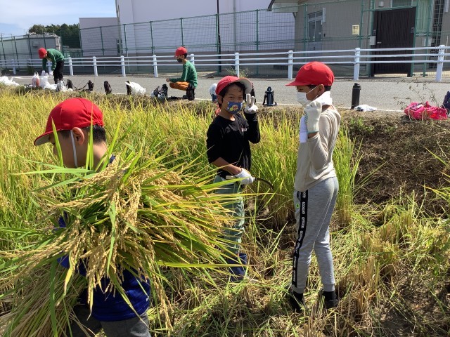 今日は、5年生が稲刈りをしました。農家さん、JAさんに協力いただいて春から育ててきた稲が、しっかりと実りました。たくさんのお米が収穫でき、子どもたちも大満足です。