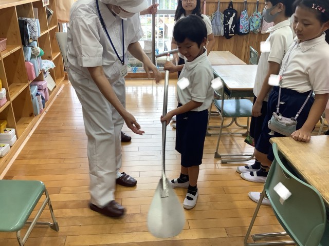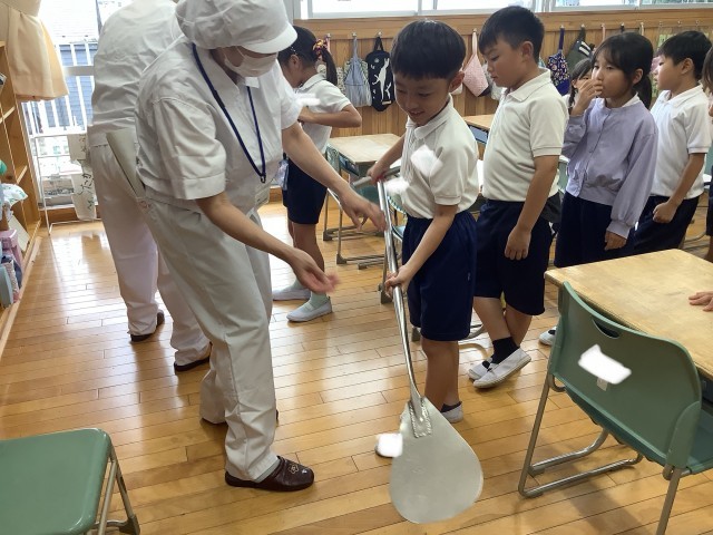 みなさんの給食を作ってくださっている南部調理場から、栄養士さんや、調理員さんが来てくださいました。給食を作る鍋の大きさや、ひしゃくの重さにびっくり!いつもおいしい給食を作ってくれていることに感謝しながら食べたいです。