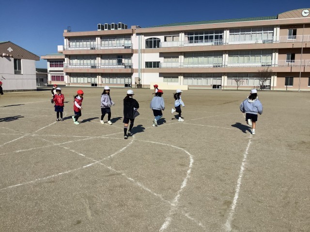 ラインの上をたどって、おにごっこをしました。急に鬼がやってきてびっくり!一生懸命逃げました。寒い日でしたが、走ったら体がぽかぽかしてきました。