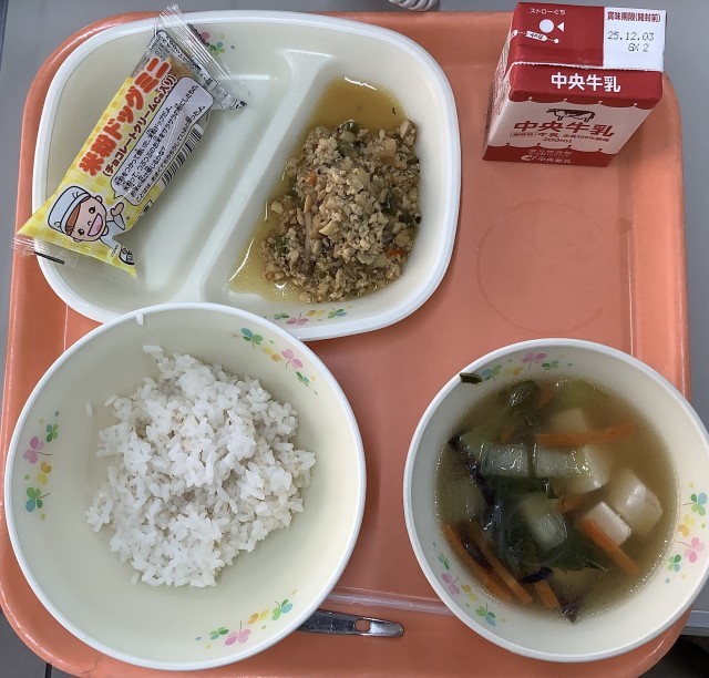 今日の給食はアジア大会応援メニューです。タイ料理のガパオライスとゲーンチュートタオフーです。アジアを感じながら、おいしくいただきました。