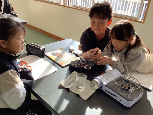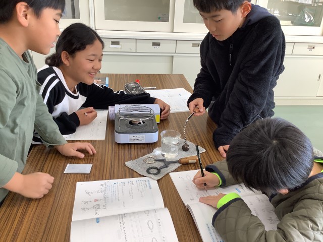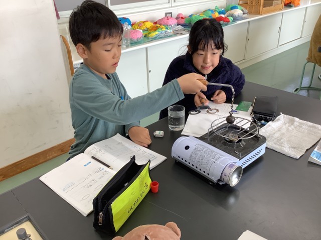 4年生の理科では、金属を熱するとその体積はどうなるか、実験をしています。金属を熱すると体積が少し増え、冷やすともとに戻る様子を確認することができました。