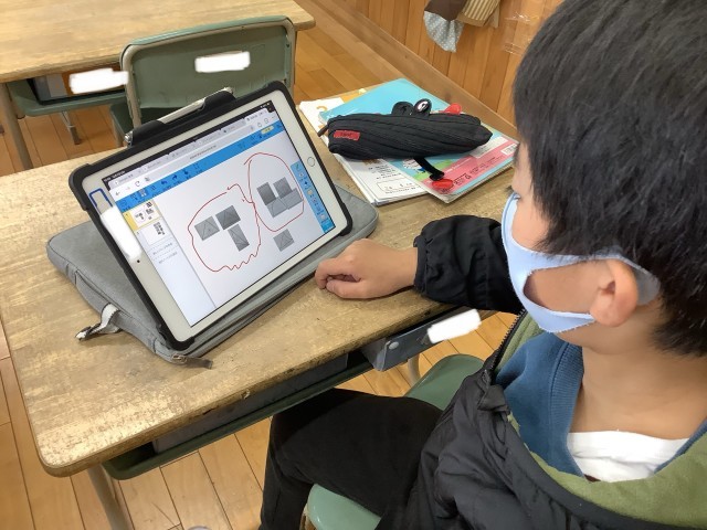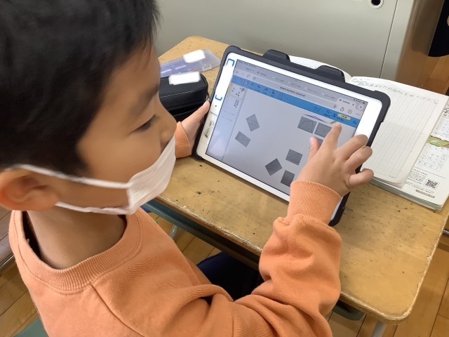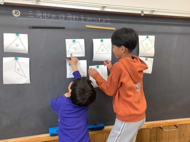 「線が3本だから、三角形だね。」「直線じゃないから、三角形じゃないんじゃない?」