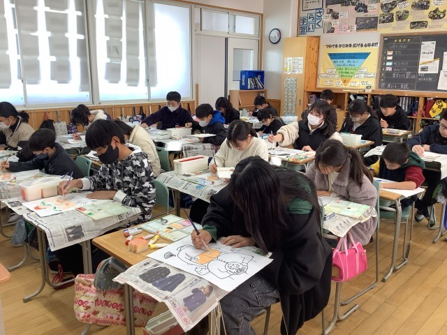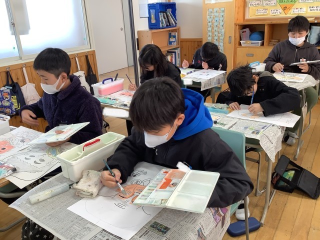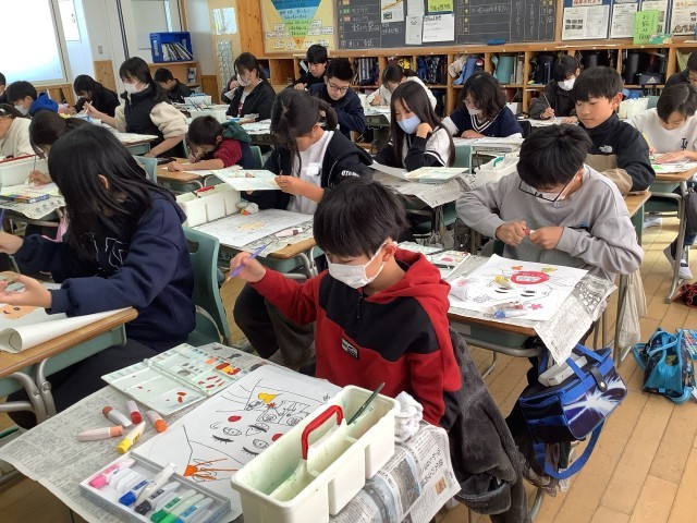 来週には桜井凧を実際に作ってみるので、今日は自分で絵を描いた桜井凧に色を塗りました。