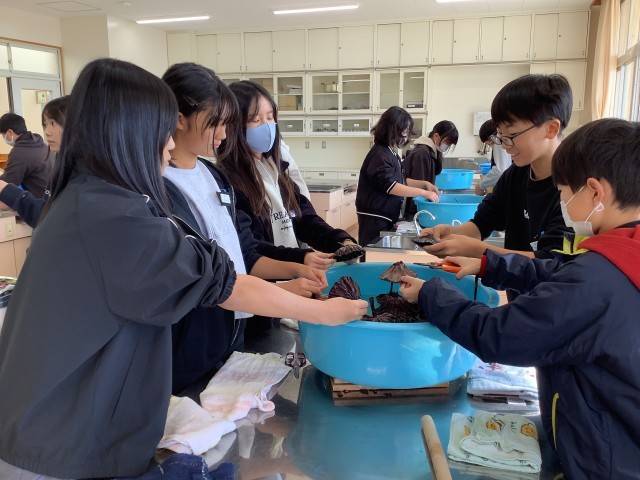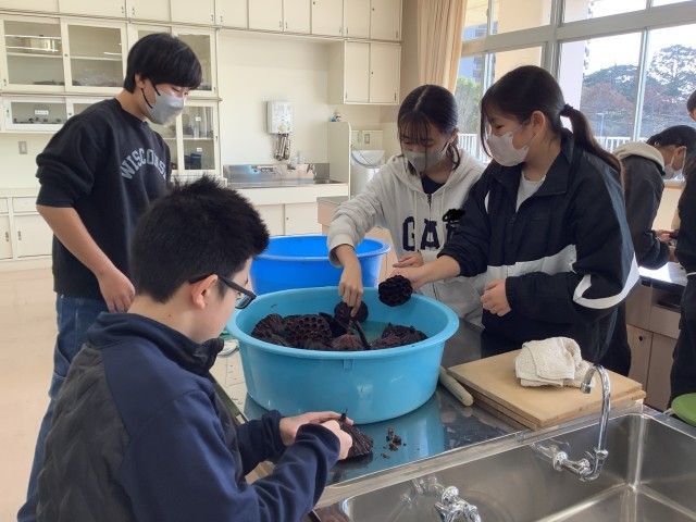 水につけておいたハスの花托はスポンジのように柔らかくなっていて、手で押しながら花托を潰していく作業を行いました。中心の茎をペンチで取りながら、キレイなコースターができるように班で工夫しながら行う姿が見られました。完成した作品が楽しみです!