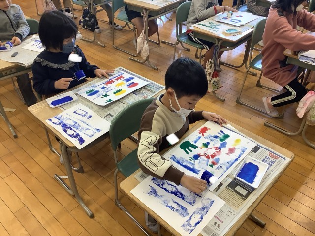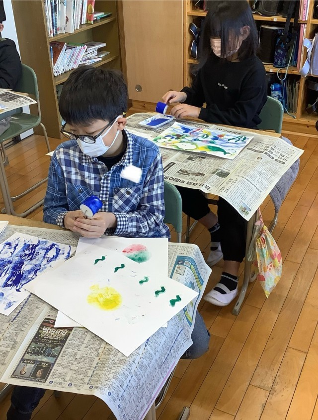 ローラーをころころ、思い思いに画用紙に色をのせました。