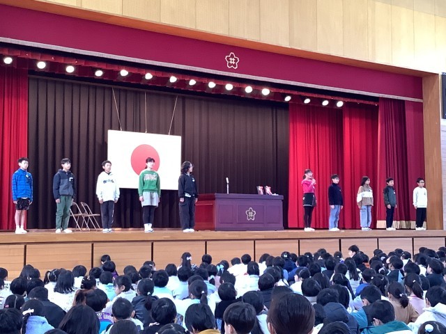 今日は、2学期の終業式を行いました。校長先生からは、桜井っ子たちが2学期の中で運動や読書、授業での発言など、たくさん挑戦する姿が見られてすばらしかったです、とお話がありました。代表児童からは、2学期にがんばったことや3学期に向けてのお話がありました。児童会代表の子たちからは、2学期の児童会活動での取り組みを振り返って、桜井っ子たちのすてきな姿を発表してもらいました。桜井っ子たちのがんばりが輝いていた2学期でした。保護者のみなさん、地域のみなさん、いつも支えていただき、ありがとうございます。