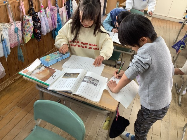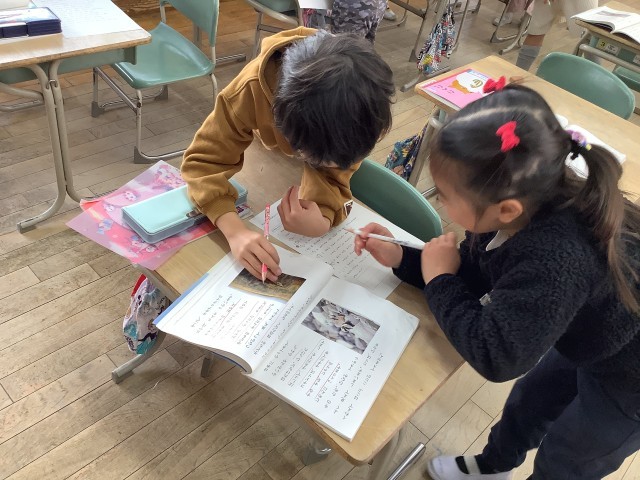 1年生の国語では、子どもを守る動物たちのお話を学んでいます。オオアリクイとコチドリで、同じところと違うところを見つけて読み取っています。友達と話し合いながら、学びを深めています。