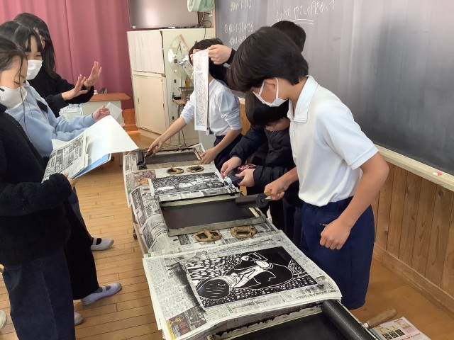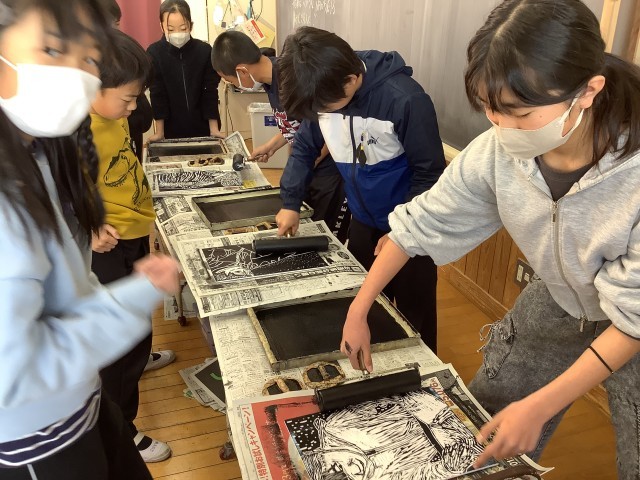 完成した版画を見せ合って出来栄えを褒め合いました。