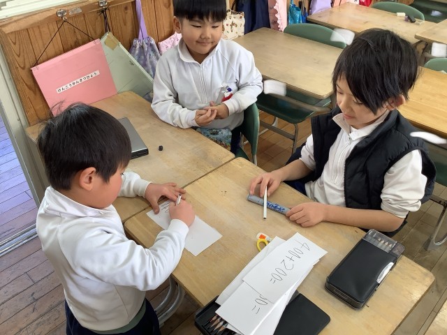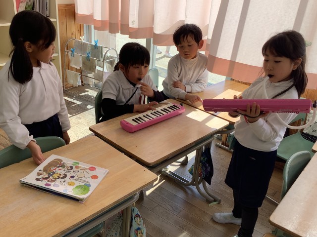 1年生では、学習発表会に向けての練習をがんばっています。この1年でできるようになったことを、グループに分かれて発表します。大きな数の計算や鍵盤ハーモニカの演奏、なわとびなどに元気よく取り組んでいます。