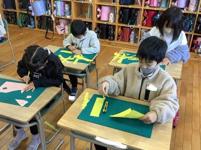 はじめてのカッターナイフに挑戦しました。「チクッ、スー」を合言葉に、安全なカッターナイフの使い方を学びました。