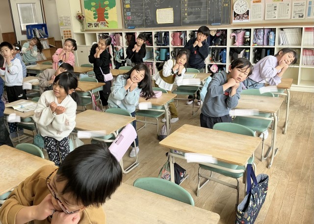 1年生が、ダンスの練習をがんばっています。卒業生を送る会で、6年生に披露します。かわいくおどって喜んでもらいましょう。